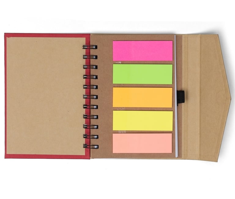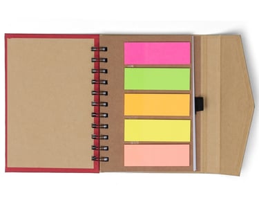 Descrição: Caderneta ecológica com autoadesivos e suporte para caneta. Caderneta com capa colorida e abertura lateral imantada, primeira folha com cinco blocos autoadesivos coloridos com aproximadamente 25 folhas e aproximadamente 68 folhas brancas pautadas. Ultima página kraft conta com suporte para caneta em nylon(não acompanha caneta).