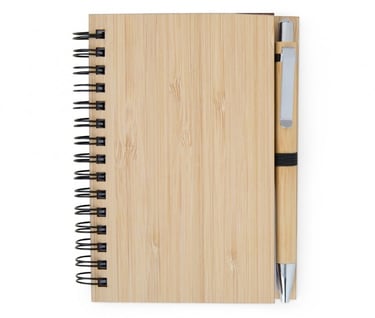 Descrição: Caderneta ecológica com caneta. Capa de bambu. Possui aproximadamente 50 folhas brancas pautadas. Acompanha uma caneta de bambu com detalhes em metal.