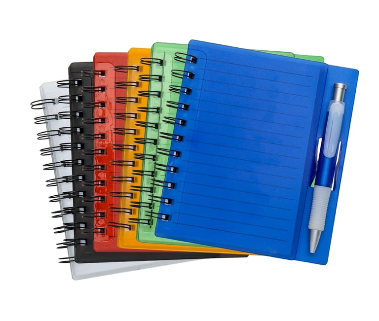 Descrição: Caderneta plástica wire-o com caneta e suporte para encaixe. Caneta plástica com detalhe emborrachado, carga esferográfica na cor azul e acionamento por clique.