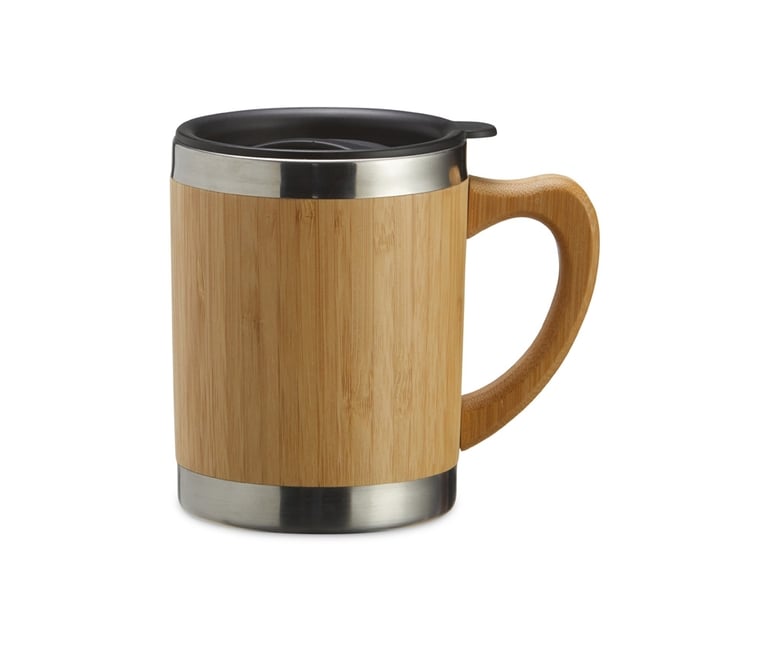 Descrição: Caneca de bambu com capacidade de 300ml. Contém tampa plástica com bocal e trava de segurança.