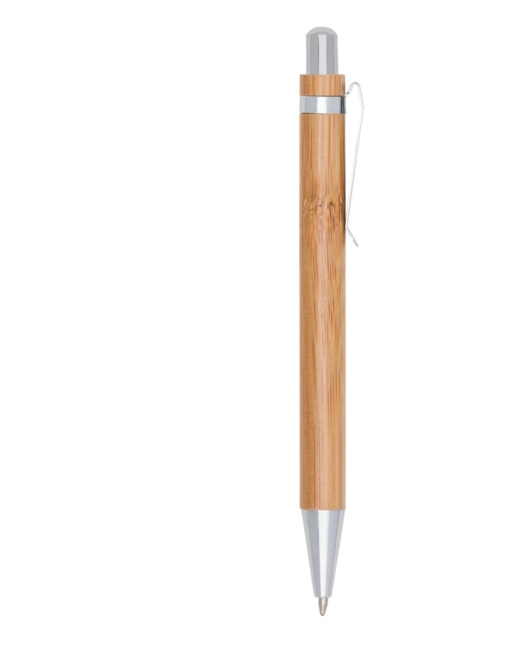 Descrição: Caneta de bambu com clipe metálico, carga esferográfica azul e acionamento por clique.