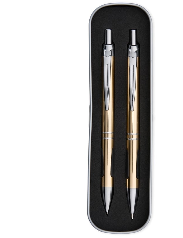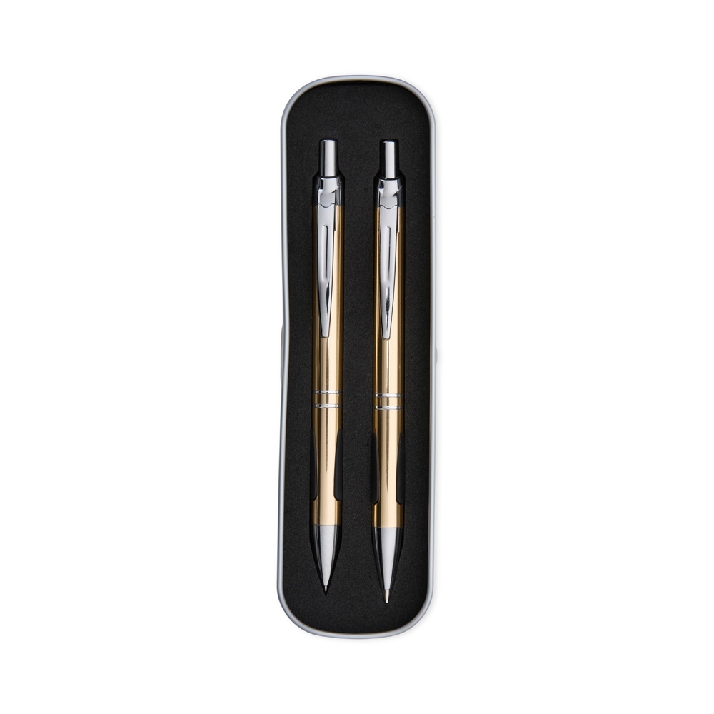 Descrição: Conjunto de caneta e lapiseira metálicas em estojo de metal. Caneta e lapiseira possuem acabamento fosco, detalhe emborrachado na parte inferior, carga esferográfica azul de 1.0mm e acionamento por clique. Estojo revestido em espuma.