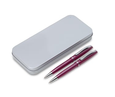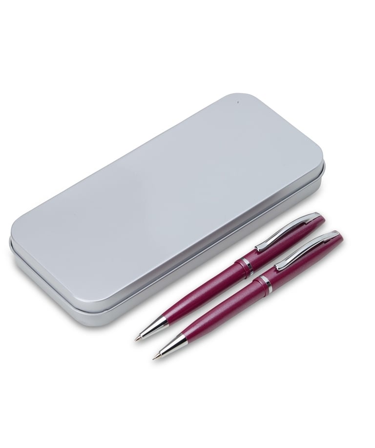 Descrição: Conjunto de caneta e lapiseira metálicas em estojo metal. Caneta e lapiseira possuem acabamento brilhante, carga esferográfica azul de 1.0mm e acionamento por rotação.