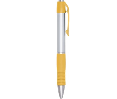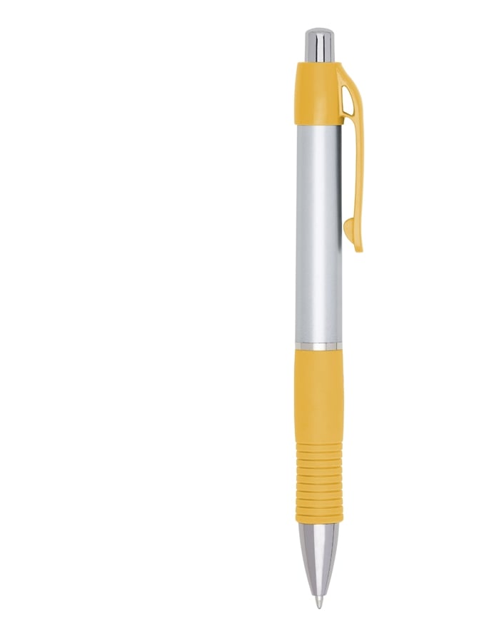 Descrição: Caneta plástica com detalhe emborrachado, carga esferográfica azul e acionamento por clique.