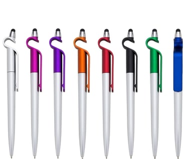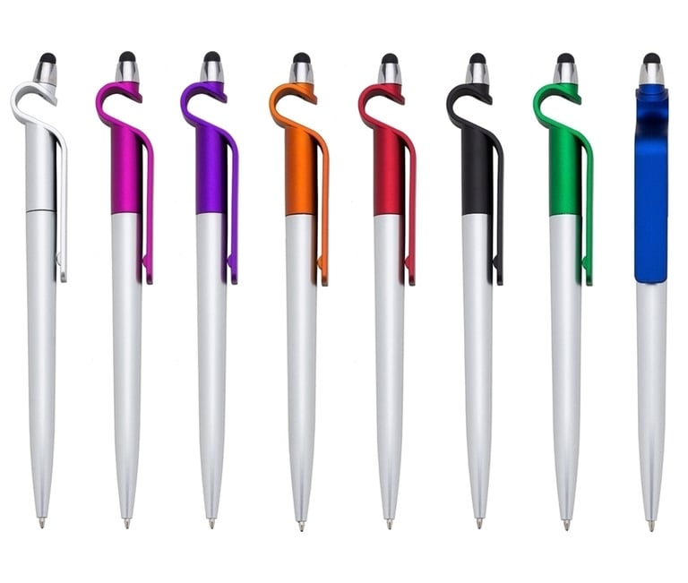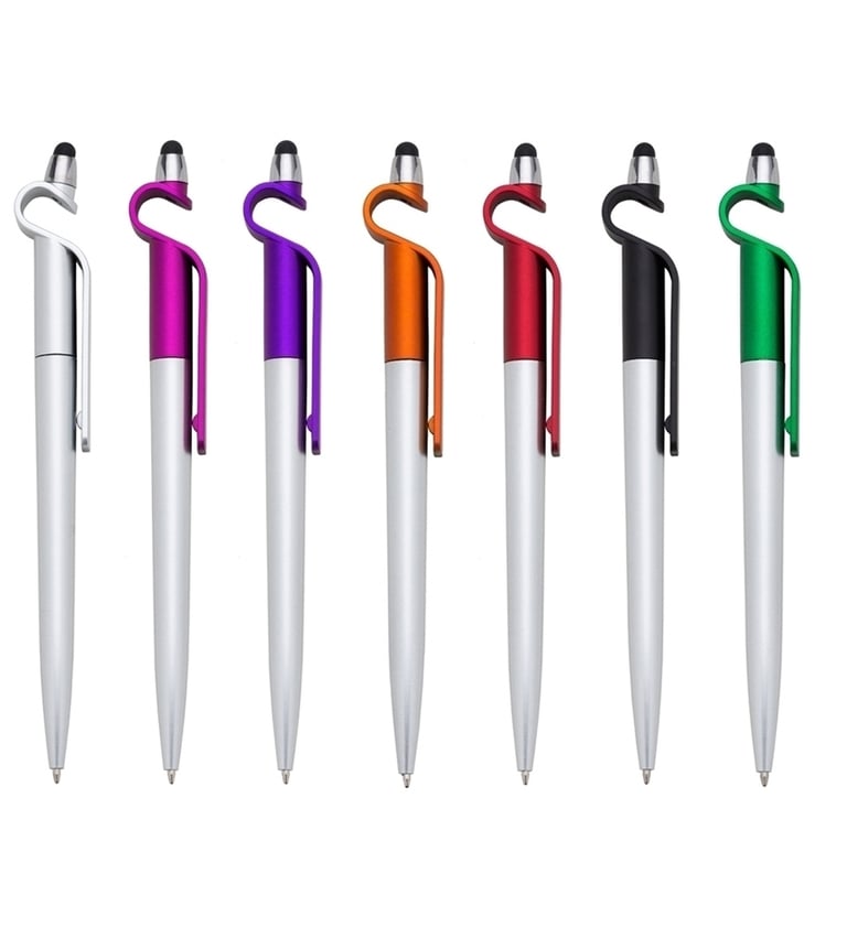 Descrição: Caneta plástica com suporte para celular e touch screen. Carga esferográfica azul e acionamento por rotação.