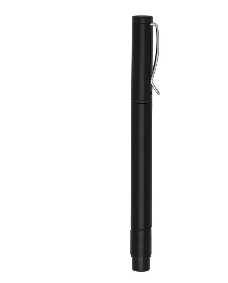 Descrição: Caneta plástica com marca texto amarelo e carga esferográfica azul, ambas com tampas protetoras.