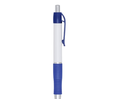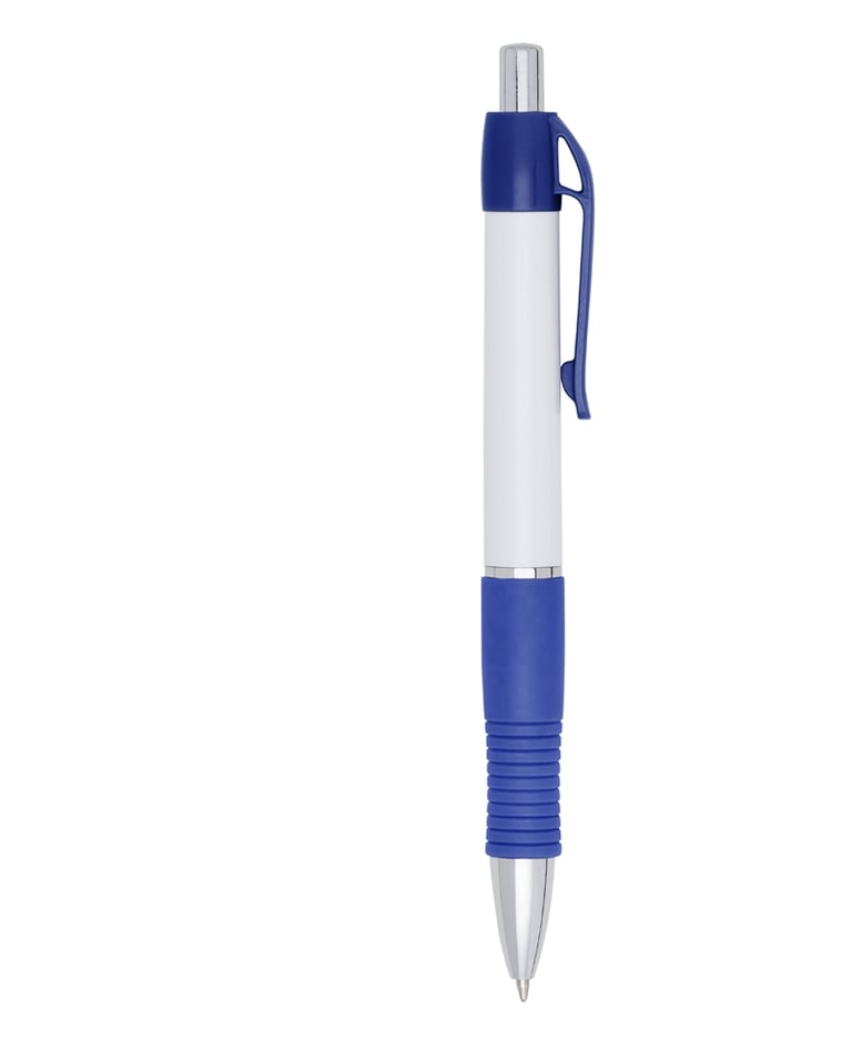 Descrição: Caneta plástica com detalhe emborrachado, carga esferográfica azul e acionamento por clique.