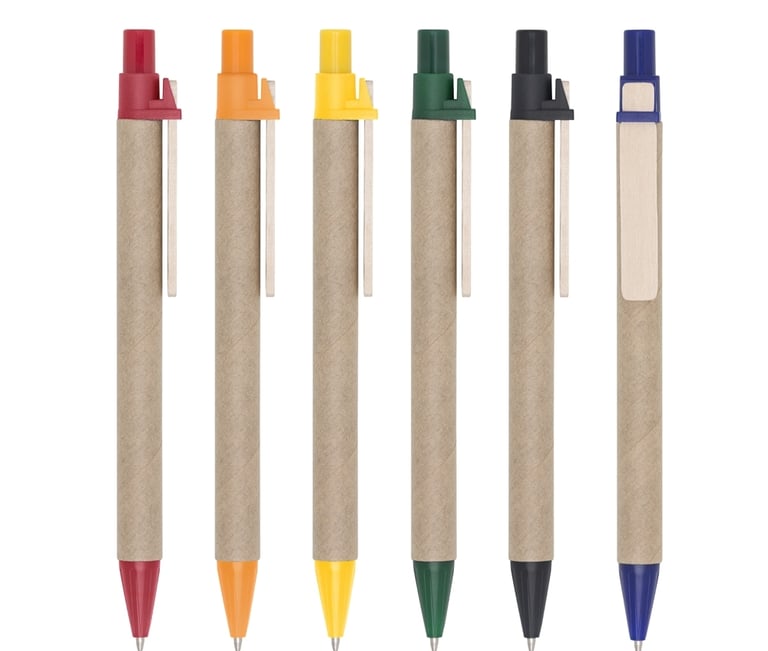 Descrição: Caneta ecológica de papelão com detalhes coloridos. Clip de madeira e ponteira plástica, possui relevo na ponteira. Aciona por clique.