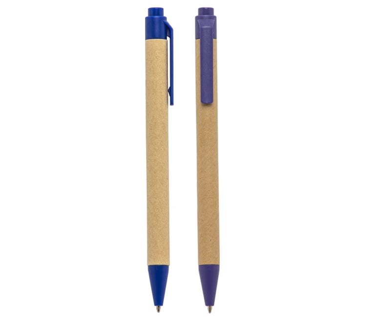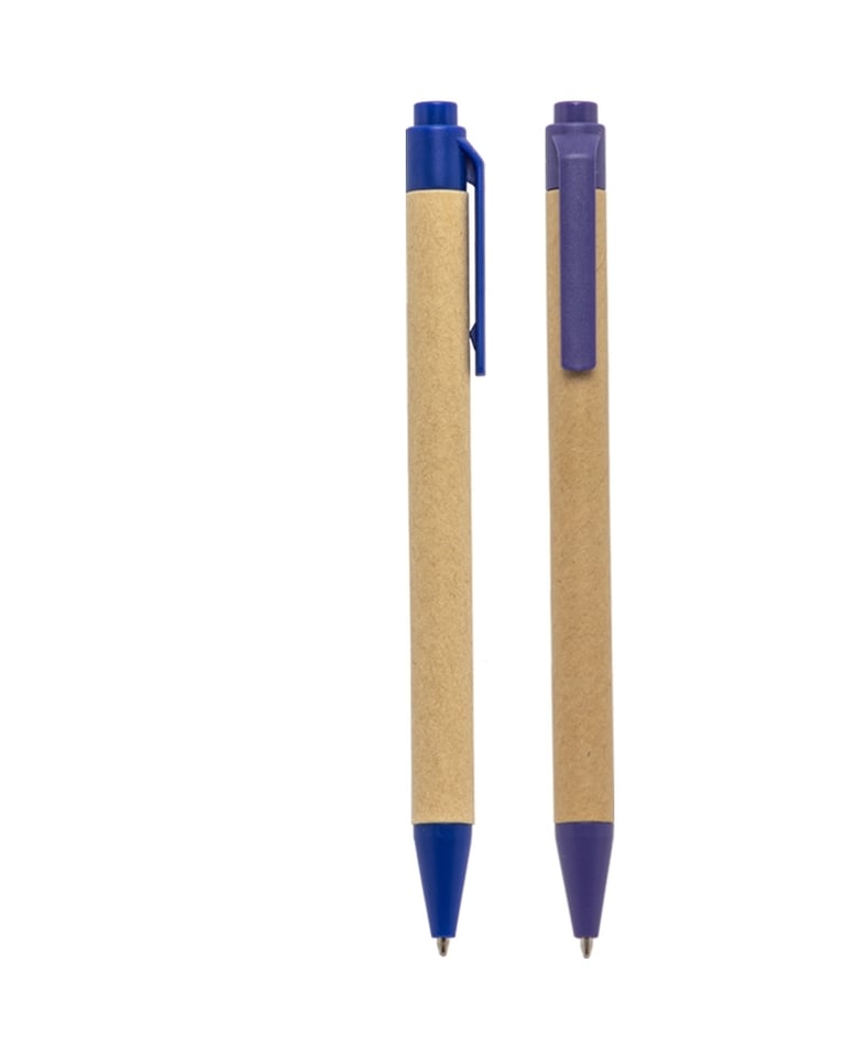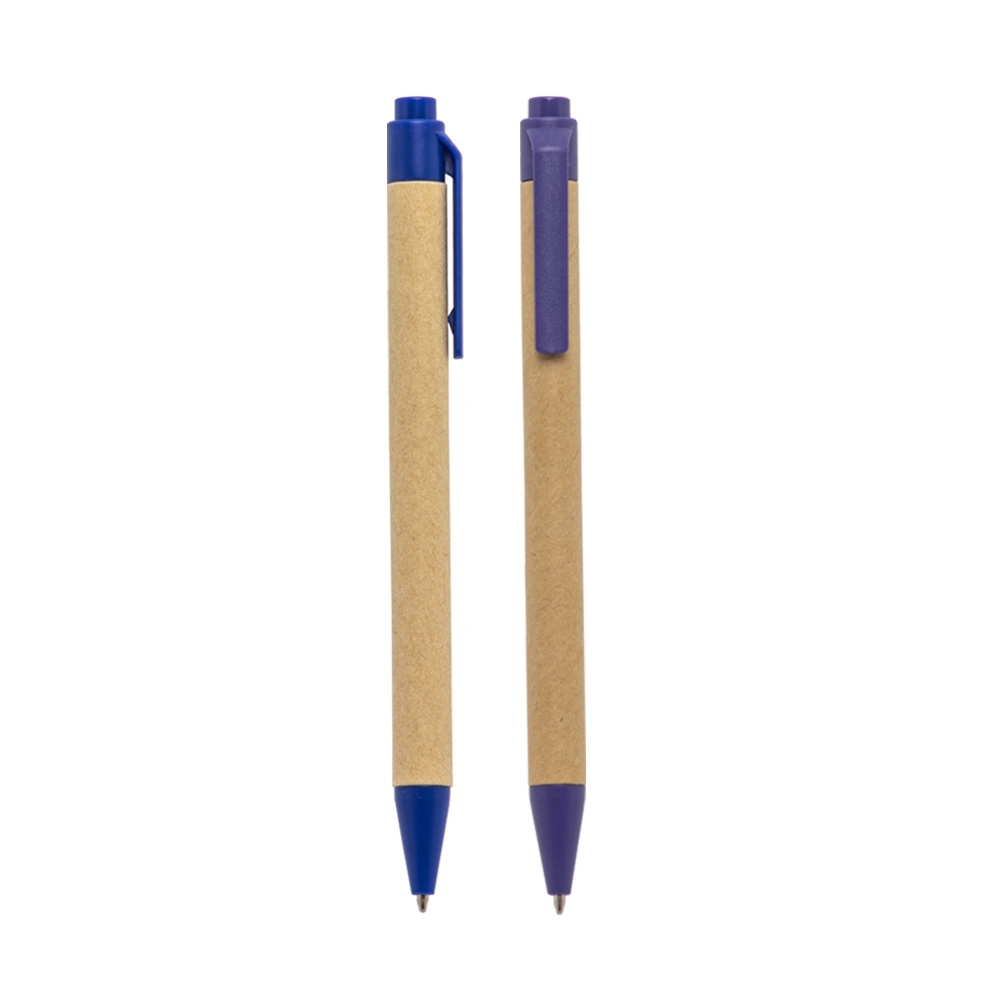 Descrição: Caneta de papelão com detalhes plásticos, carga esferográfica azul e acionamento por clique.