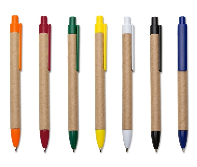 Descrição: Caneta de papelão com detalhes plásticos, carga esferográfica azul e acionamento por clique.