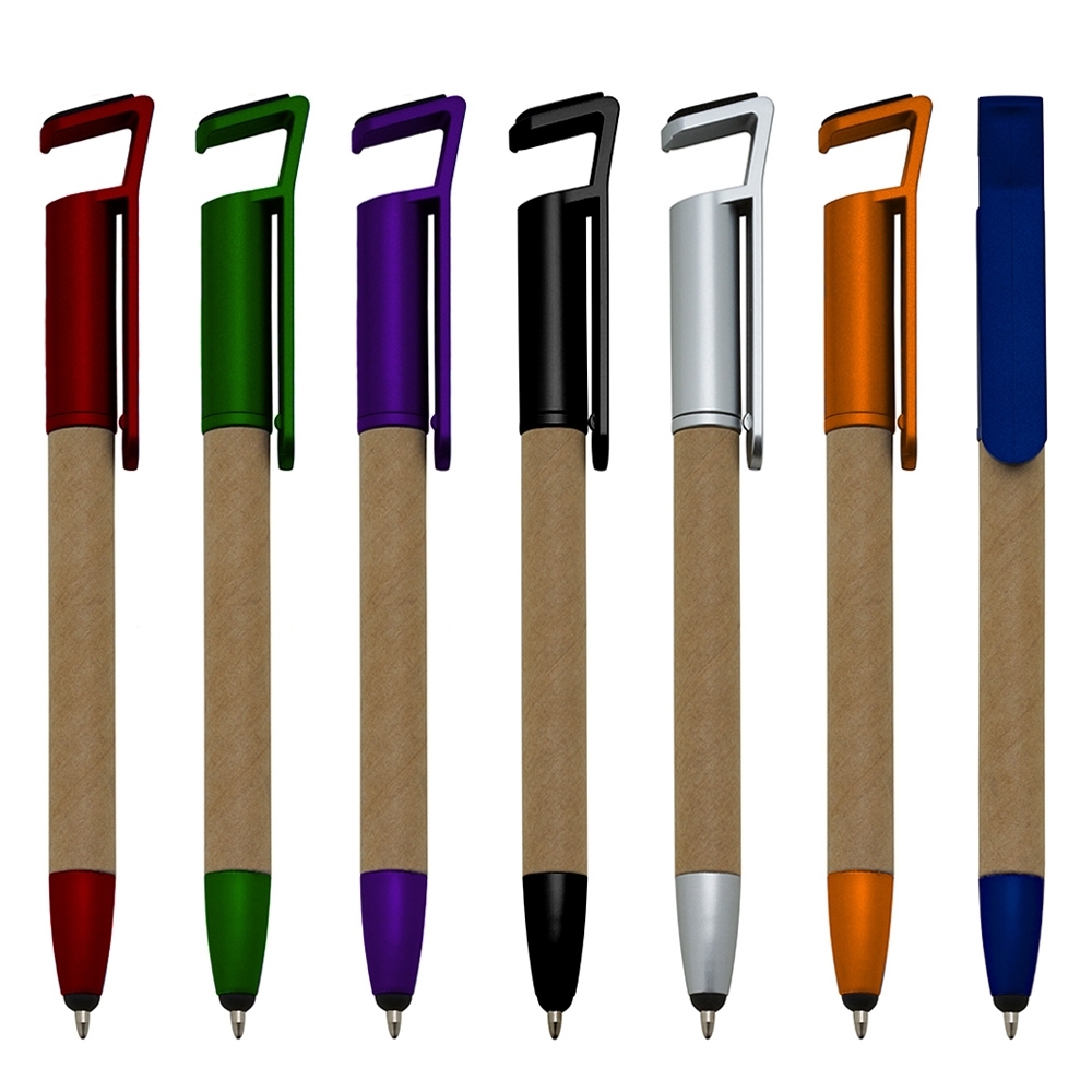 Descrição: Caneta de papelão com detalhes plásticos, contém suporte para celular, ponteira touch screen e limpador de tela. Carga esferográfica azul e acionamento por rotação.