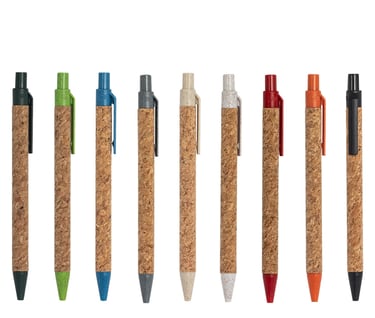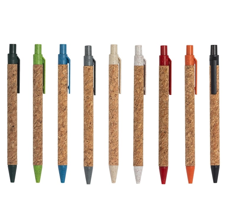 Descrição: Caneta de cortiça com detalhes em palha de trigo, carga esferográfica azul 1.0mm e acionamento por clique.