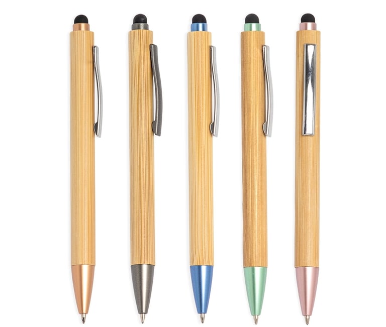 Descrição: Boa escrita começa com escolhas conscientes. A nossa caneta ecológica touch de bambu, é a opção ideal para dias intensos de anotações. Com detalhes plásticos e ponta touch, é possível utilizá-la em dispositivos eletrônicos sem tocar diretamente na tela, evitando manchas indesejadas. Essa caneta é a combinação perfeita de sustentabilidade e praticidade.
