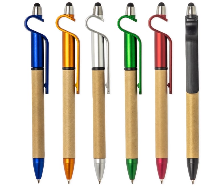 Descrição: Caneta de papelão com detalhes plásticos, contém suporte para celular e touch screen. Carga esferográfica azul e acionamento por rotação.