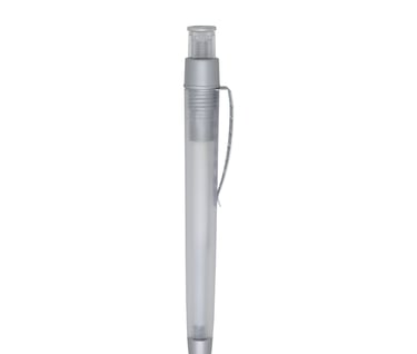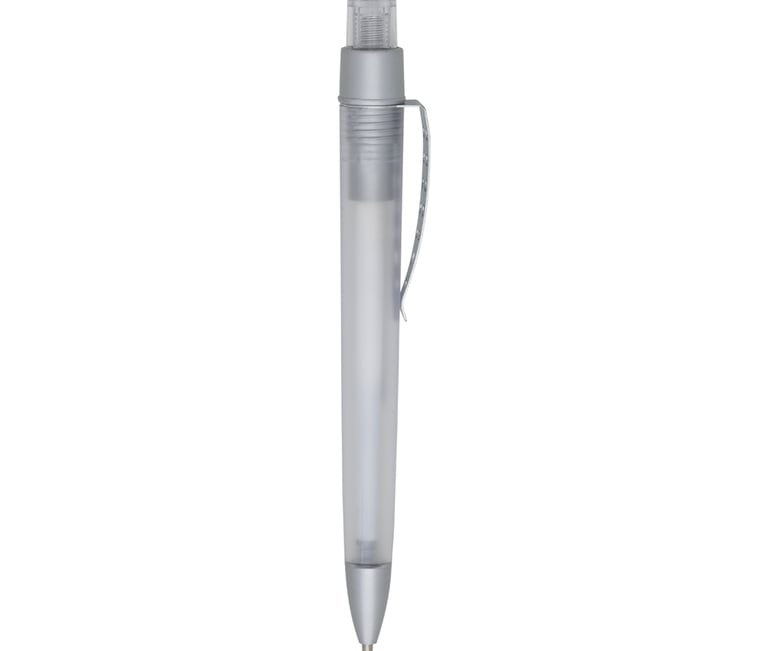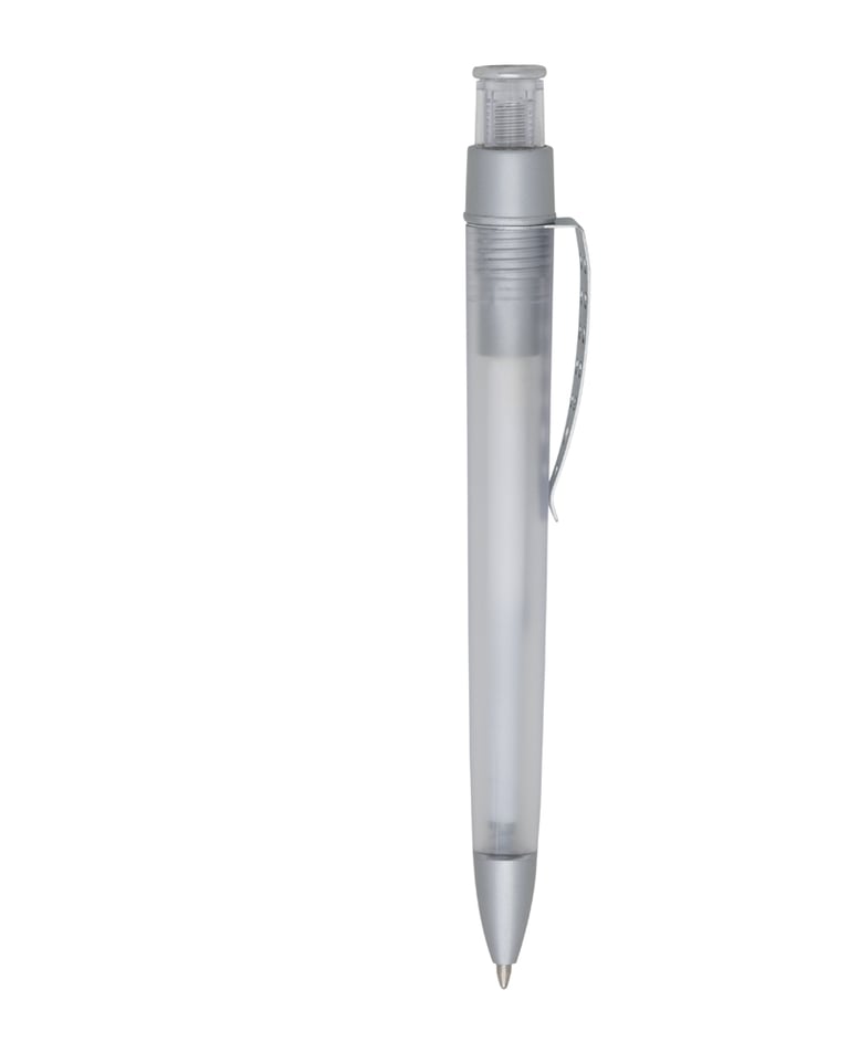 Descrição: Caneta plástica com clip metálico vazado, carga esferográfica azul e acionamento por clique.