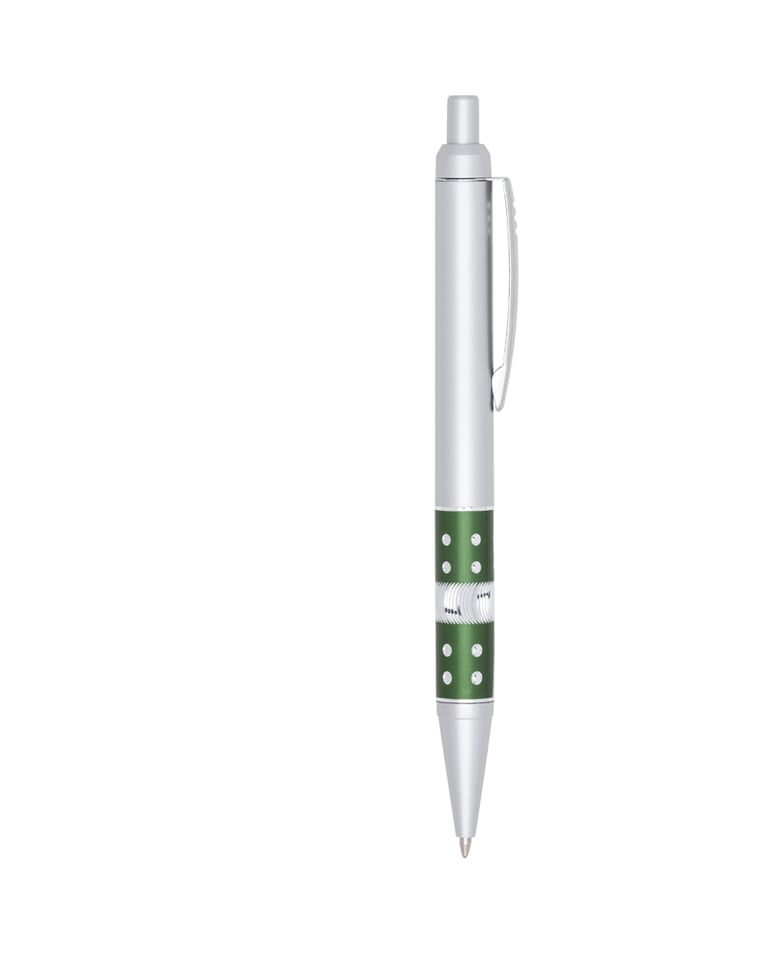 Descrição: Caneta plástica com detalhe strass, carga esferográfica azul e acionamento por clique.