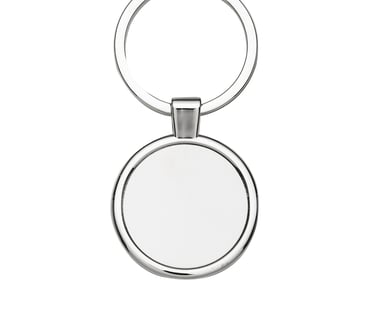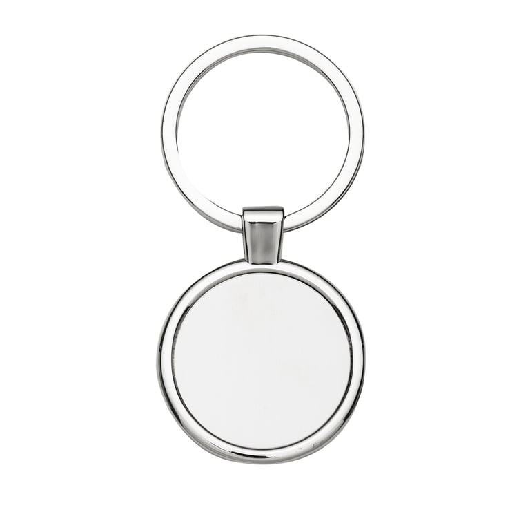 Descrição: Chaveiro de metal redondo com chapa central, verso liso.