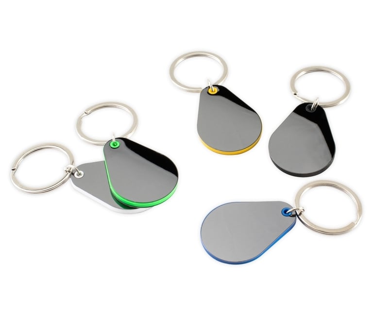 Descrição: Chaveiro com detalhe plástico e chapa metálica grafite, personalizável frente e verso.