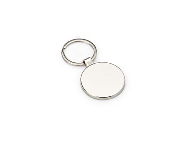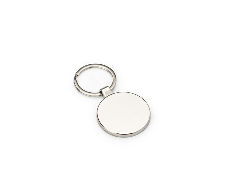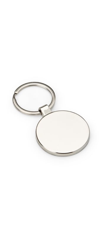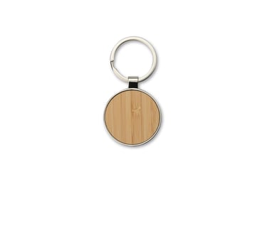 Descrição: Chaveiro de metal redondo, frente com detalhe em bambu e verso liso.