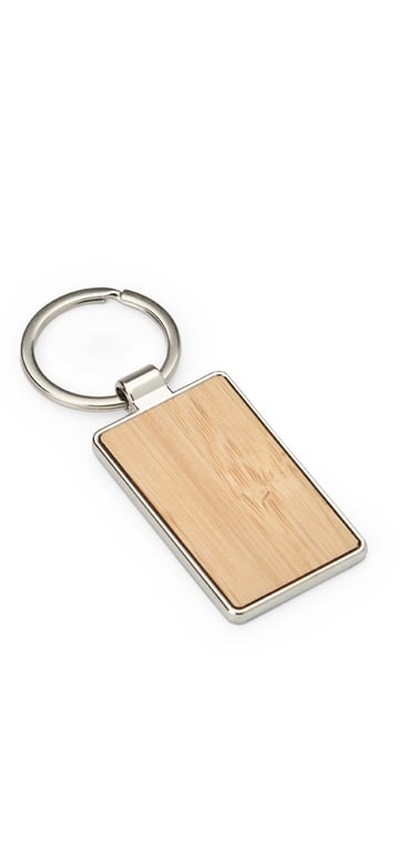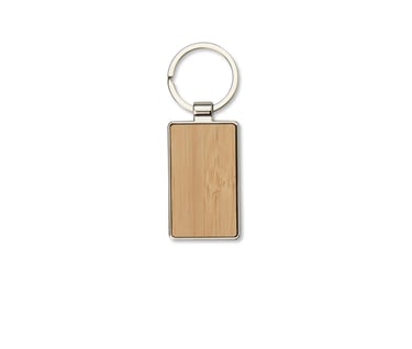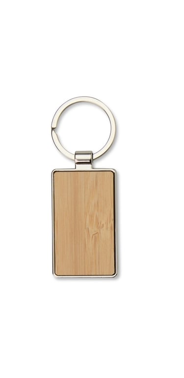 Descrição: Chaveiro de metal retangular, frente com detalhe em bambu e verso liso.