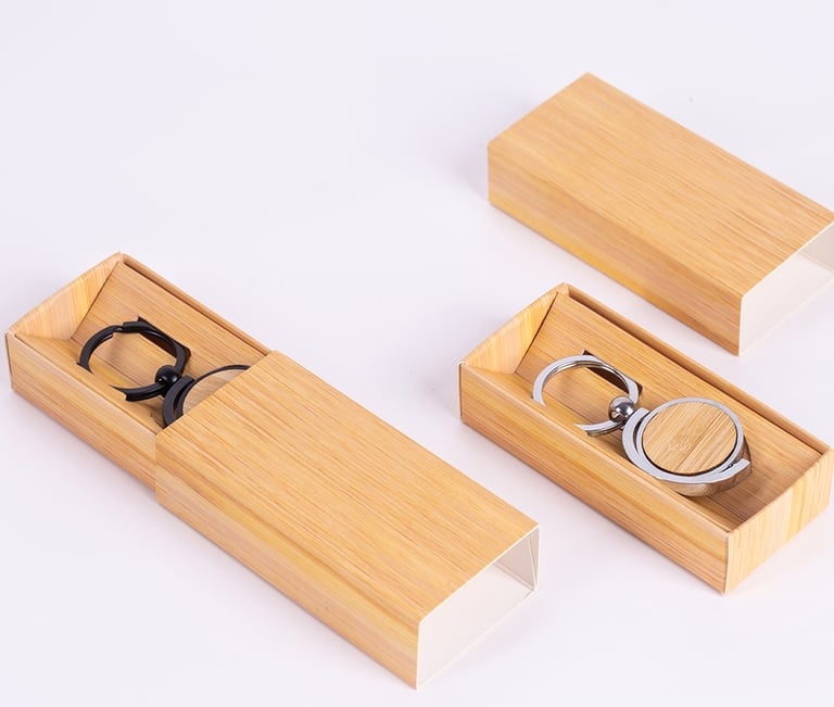 Descrição: Chaveiro de metal, com detalhe circular de Bambu. Acompanha estojo de papel.