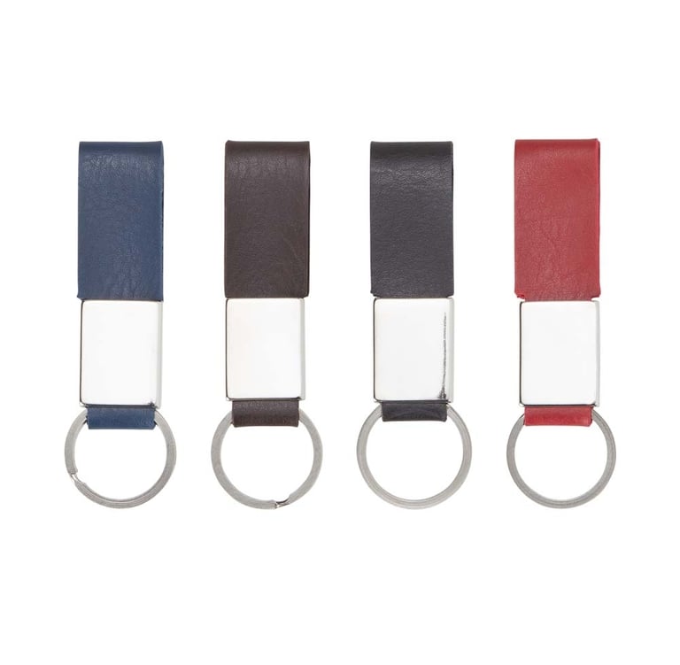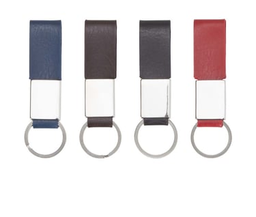 Descrição: Chaveiro de metal com alça em couro sintético.