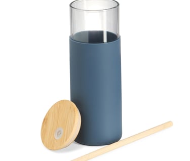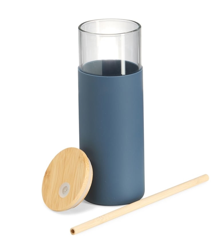 Descrição: Copo de vidro borossilicato com capacidade de 500ml. Inclui canudo e tampa de bambu com abertura para canudo, além de uma luva de silicone para melhor aderência.