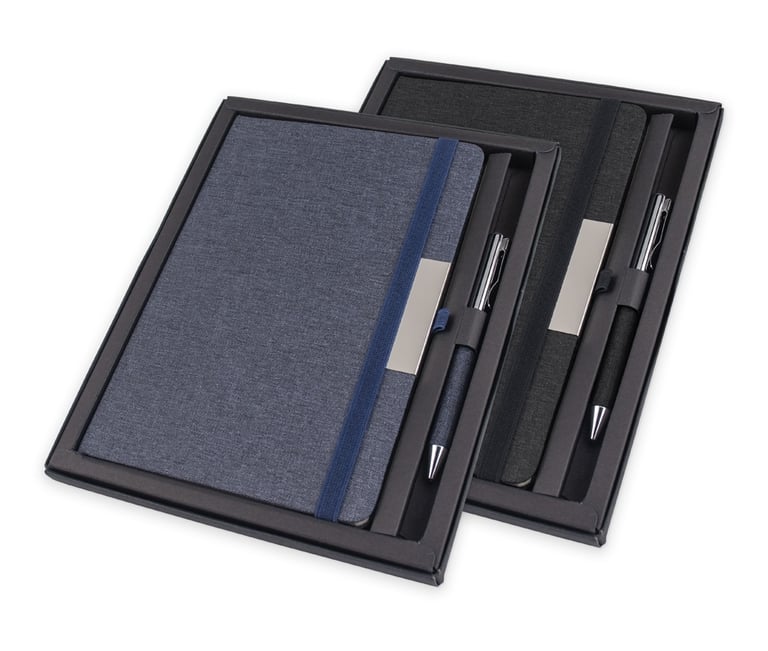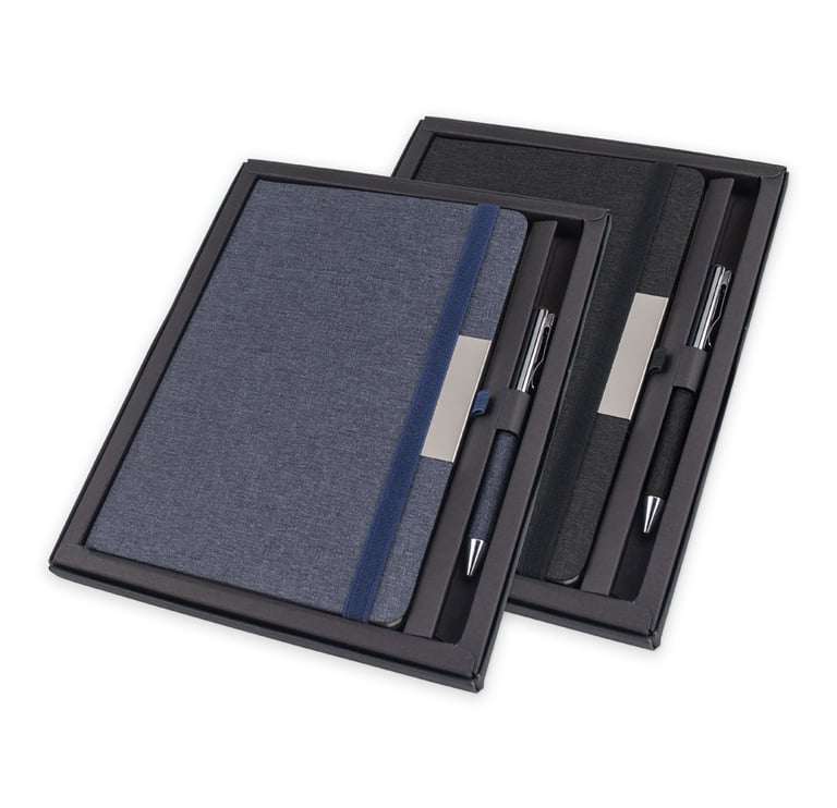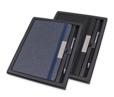 Descrição: Elegância e praticidade durante as anotações. Produzido com metal e tecido em rPET reciclado, o nosso kit executivo de duas peças conta com uma caderneta com aproximadamente 80 folhas pautadas na cor marfim, conta também com suporte para caneta e elástico para lacre. Inclui também uma caneta com acionamento por rotação e carga esferográfica na cor azul. Todos acomodados em um estojo de papelão com tampa, perfeito para presentear ou guardá-los com cuidado.