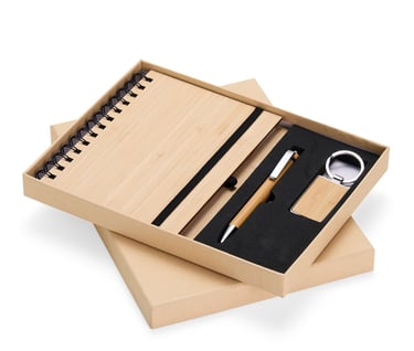 Descrição: Kit composto por 3 peças: sendo uma caderneta de bambu com capa dura, contendo aproximadamente 70 folhas brancas pautadas, uma caneta de bambu com clipe metálico e um chaveiro de bambu com detalhe em metal. Item perfeito para quem busca elegância, sustentabilidade e o toque natural que só o bambu proporciona.