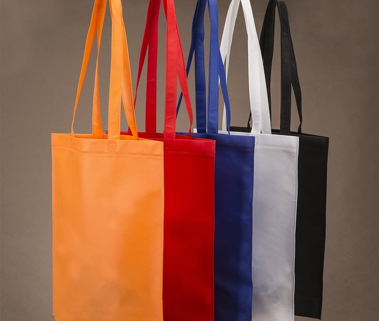 Descrição: Sacola colorida com alça em material TNT, possui símbolo ecológico/reciclável na costura da alça.