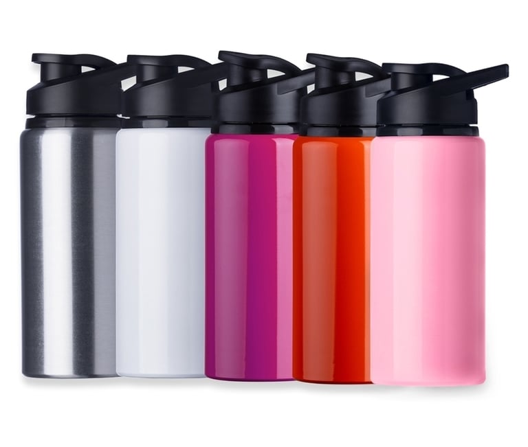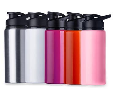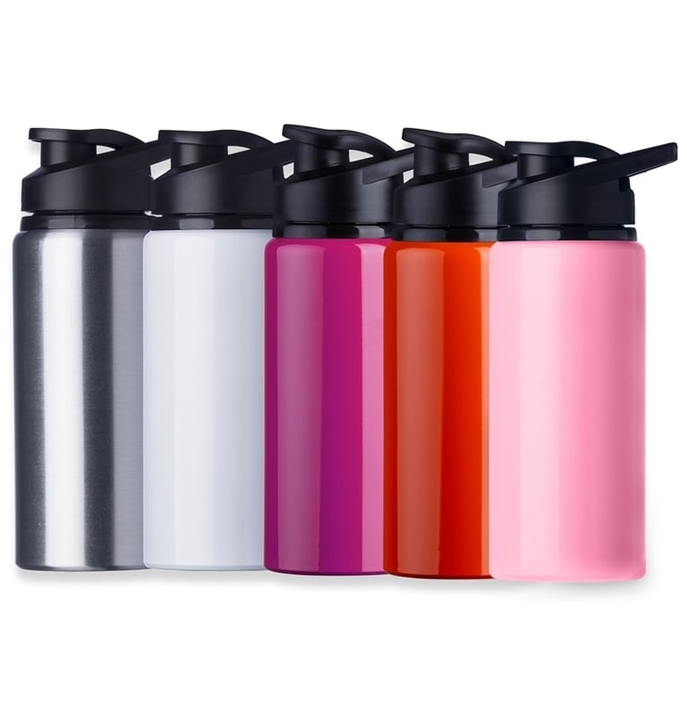 Descrição: Squeeze alumínio de 600ml com pintura brilhante. Squeeze com tampa plástica rosqueável, alça e tampa protetora para o bocal.