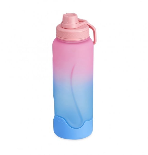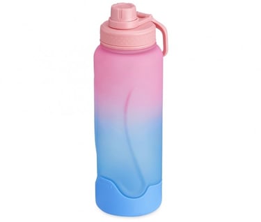 Descrição: Squeeze plástica 1,1 litros com base de silicone anti-impacto (removível). Tampa com alça para transporte e tampa de proteção para o bocal.